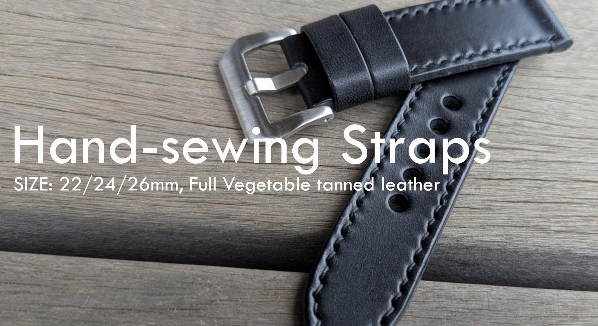 ■商品説明 オイル染料仕上げのスムースレザーの厚手の一枚革にて仕立てたパネライスタイル、腕時計用替えベルト! 品質に定評ある国産なめしのフルベジタブルタンニン仕上げのオイルヌメ革は、手触り、色合いもよく、革密度も詰まっており、耐久性はもちろん、耐水性にも優れている腕時計のベルトには最良の素材。 パネライや、ロレックスなどの大柄なダイバーズウォッチに負けない厚さ、約1.6-1.8MMに革を漉き使用しています。 そんなヌメ革を、このミシンが無ければ、仕事が出来ないとまで、職人達に言わしめた名機(SEIKO TE-5)により仕立てたストラップ。他のどんなミシンを使っても再現できない唯一無比の立体感ある縫目を是非、手に取って頂きたい。 断面部のコバ処理は、蜜蝋を含む独自のワックスで丁寧に磨き上げられており、最低限の防水性をもち、その断面は、アメ色の輝きを放ちます。 ■商品仕様 ・素材:ヌメ革 ・長さ(テールサイド/バックルサイド):Lサイズ:約130MM/約80MM Mサイズ:約125MM/約75MM ・ラグ幅:22MM/24MM/26MM ・ベルトホールの位置: ※Lサイズ(ラグ側から約5cmより8MM間隔で5ホール) ※Mサイズ(ラグ側から約4.5cmより8MM間隔で5ホール) ・厚さ:約3.4-3.8mmほど ・定カク/遊カク:定カクなし、遊カク2個 ・対応種別:ラグ幅に合致する腕時計※ピン位置により一部非対応 ・注意:厚さ約1.6-1.8mm程の一枚革にて仕立てております。 厚手のレザーの為、腕時計本体ラグのピンの位置により、対応しない場合がございます。 ・備考 1:写真は、ラグ幅24mmの製品となります ■備考 天然のフルグレインレザー(ヌメ革)を使用しておりますので、色ブレ、生痕傷、トラ、シワ、ホクロ、毛穴、タンニンムラなど、それぞれに個体があり、革本来の風合いでございますので、前述した理由による返品は、お受付できません。