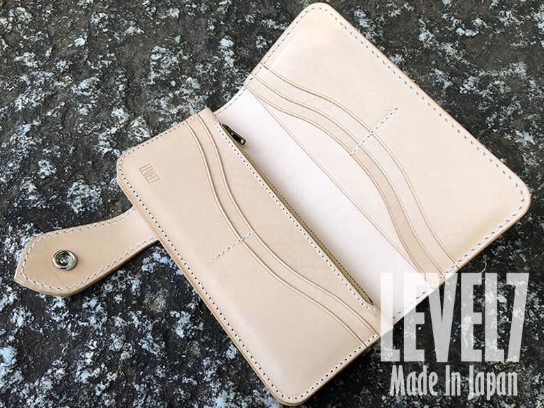 財布のインナーは、当社メイン機【足踏みミシン TE-5】にて縫製され、アウターは、極太の糸を手縫いにて縫製した仕様。 機能性、デザイン性を十分に考え設計していますので、使いやすさも抜群です。