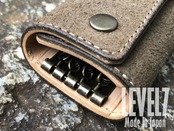 レザー/革は、国産本革/フルベジタブルタンニンの床ヌメ革を染色しシッカリとオイルを馴染ませたしっとりとした肌触りに仕上げたベロアをナチュラル(イタリアンレザー)のヌメ革と貼り合わせ(化粧貼り)した高級感ある作り。 表革に約1.5MMのベロアに約1.3MMのヌメ革を貼り合せ、内部パーツには、機能性、実用性、耐久性、デザイン性を考慮し、よりスリムに製品化しました。
