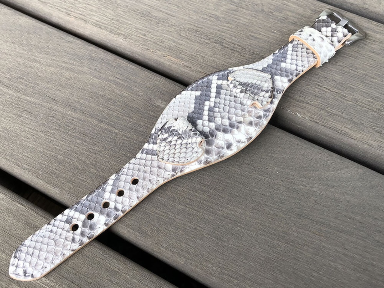 アウターには、約1.8MMのイタリアンレザー(生成り ヌメ革)と本革ダイヤモンドパイソンを貼り合わせ、裏側に約1.0MMほどに漉いたイタリアンレザー(生成り ヌメ革)を張り合わせた3層の構造にて製作しています。
